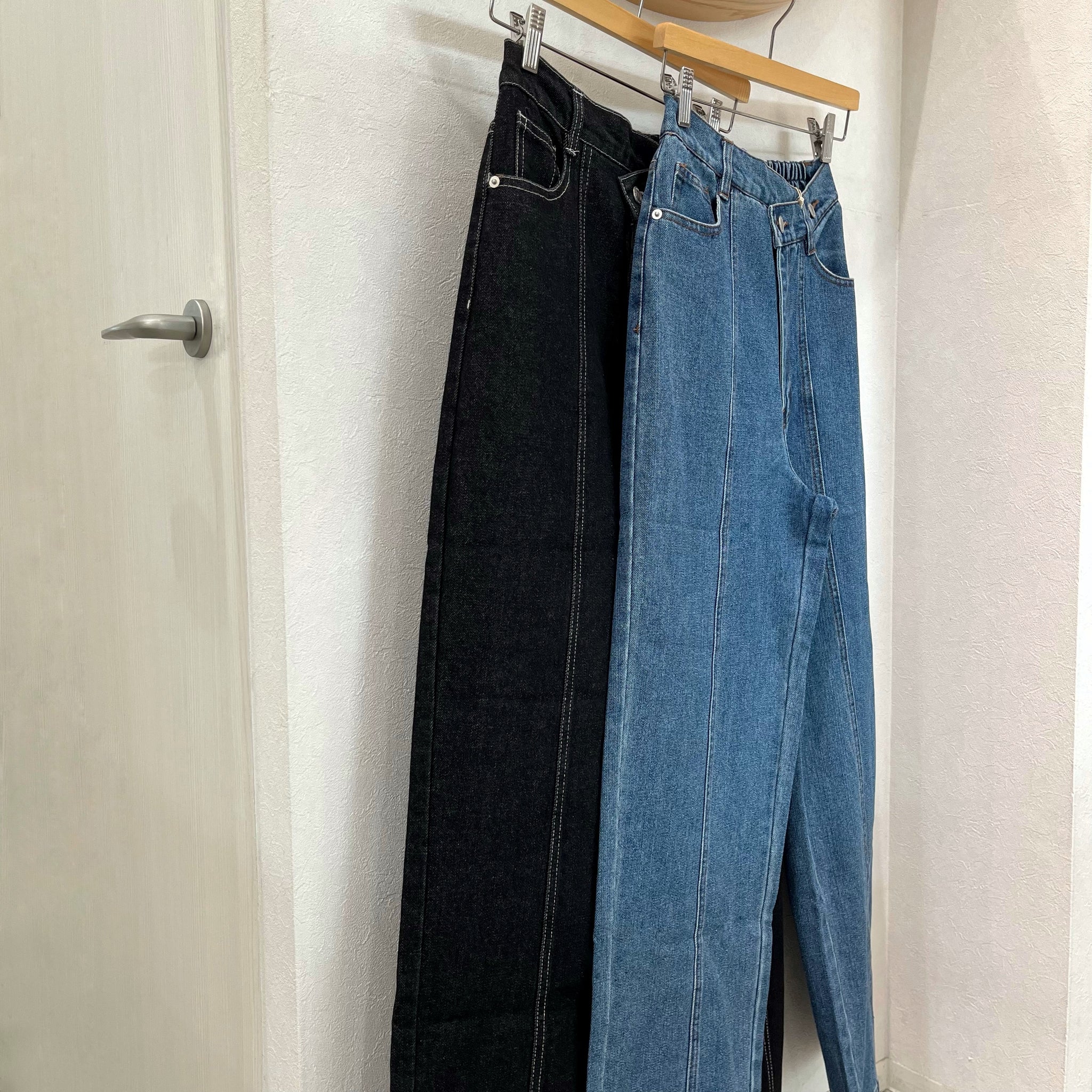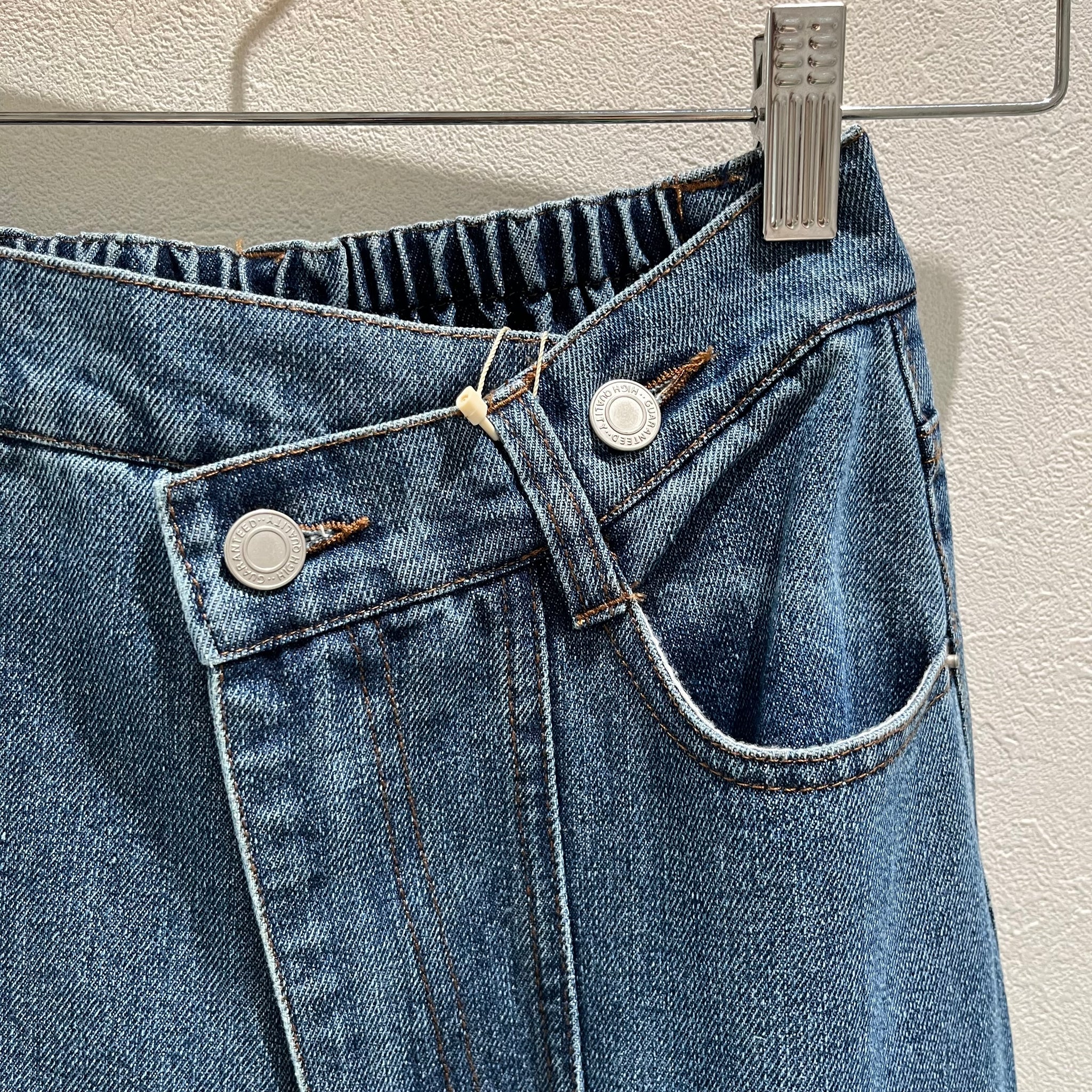 ウエストには2つのボタンを配し、気分やコーデに合わせてベーシックなストレートデニムとしても、