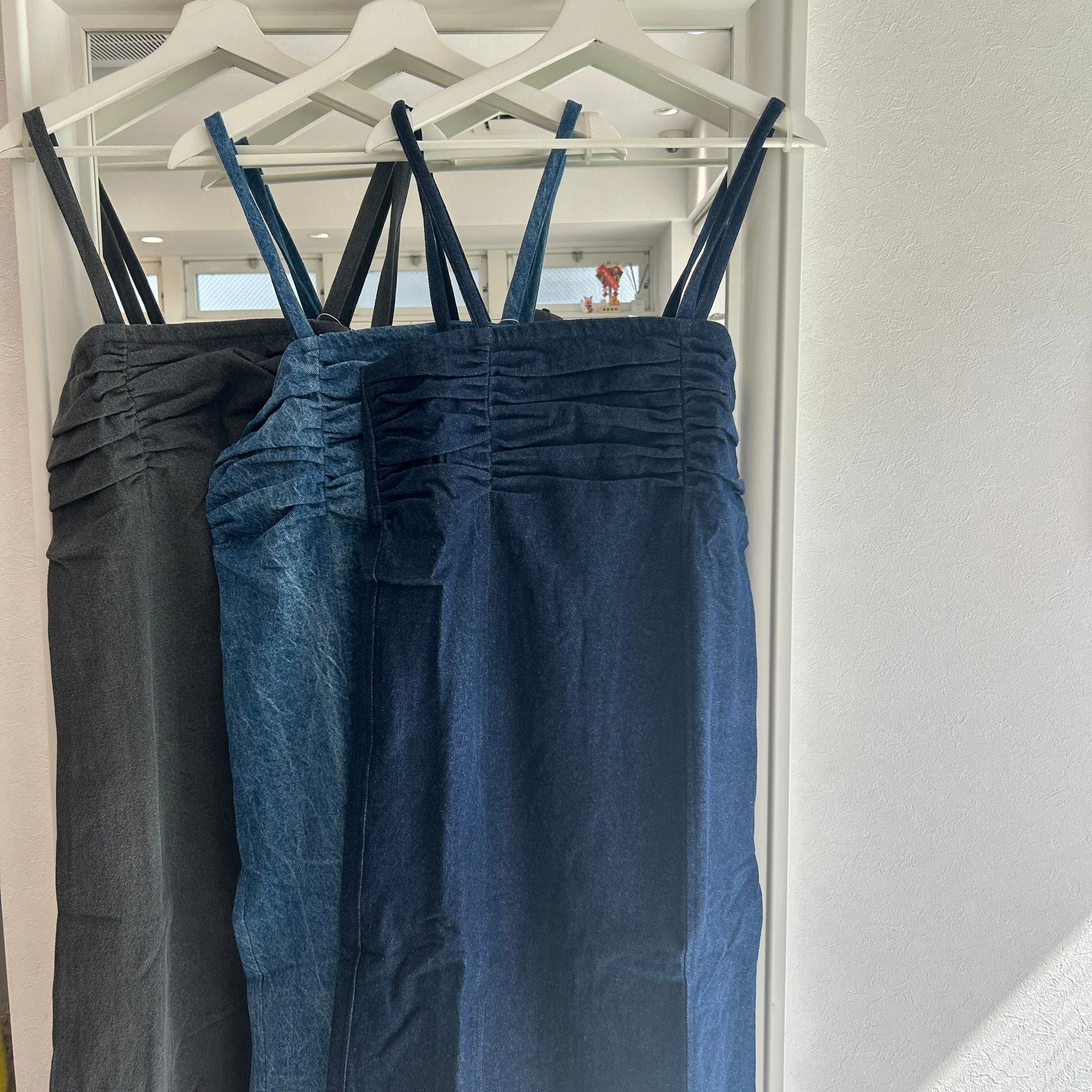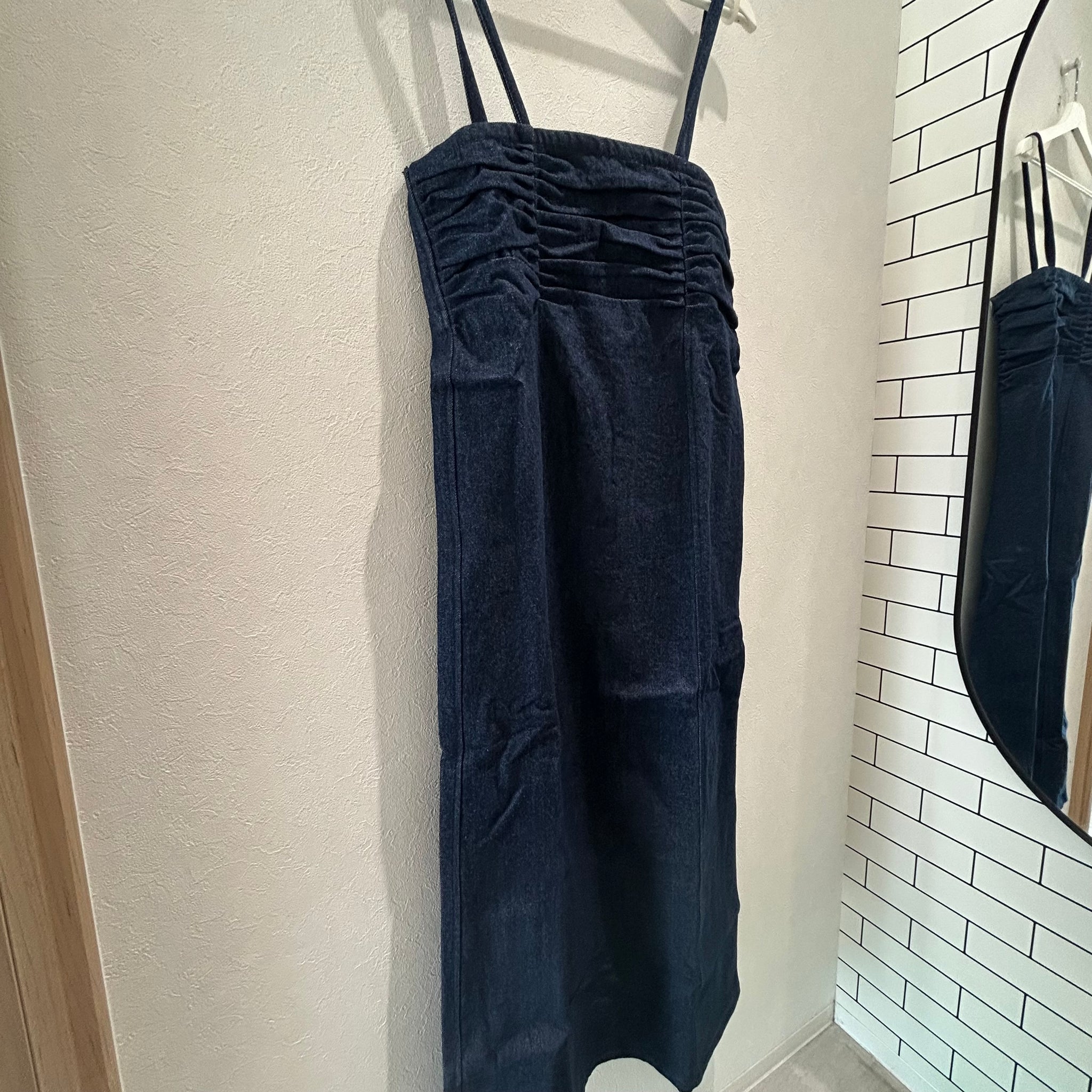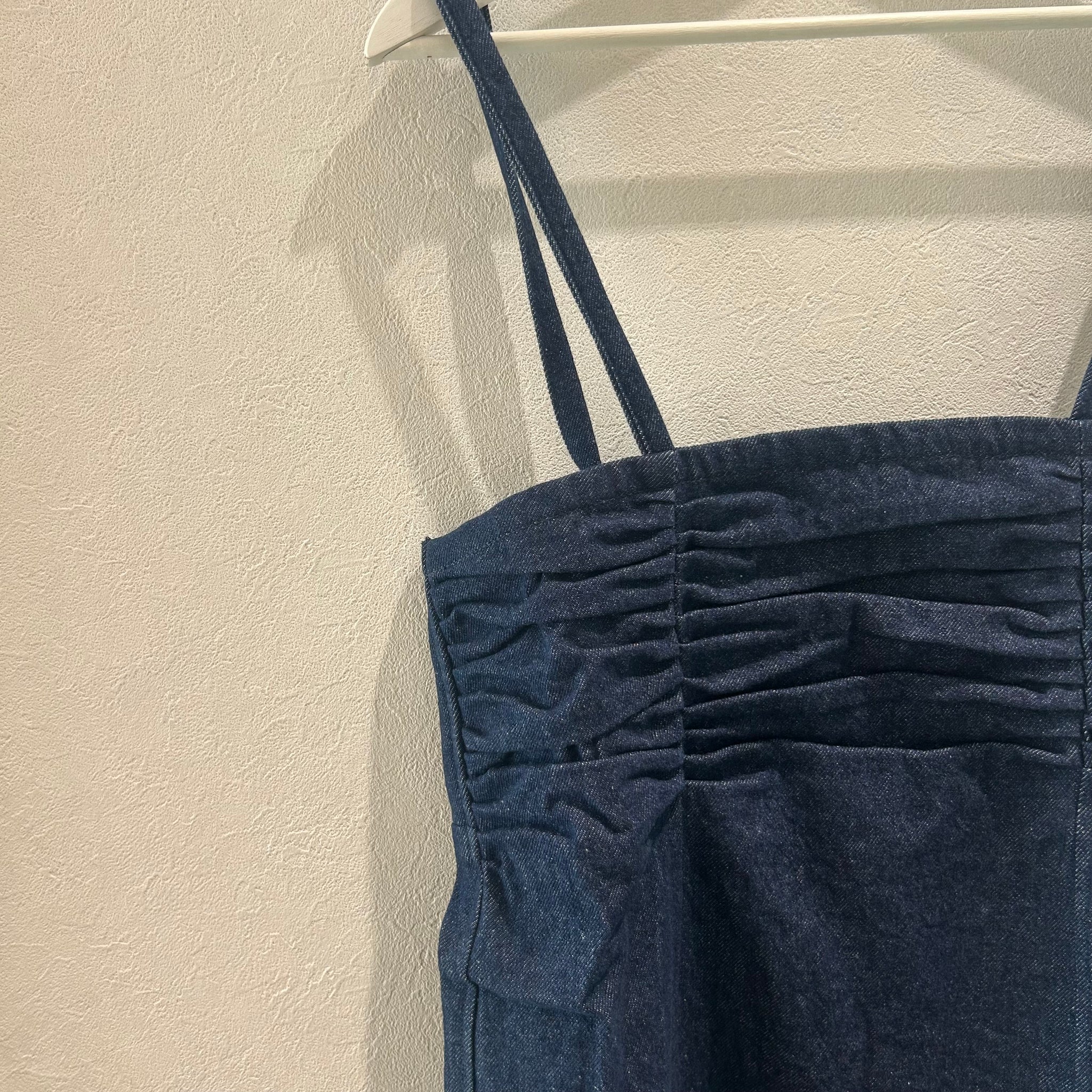 胸元のギャザーが印象的なデニムキャミワンピース。ギャザーが入ってもゴワゴワすることはないのでレイヤードも安心してご着用いただけます。肩ヒモはリボン結びで長さ調整もできるので着丈を変えつつデザインをプラスできるのも嬉しいポイント!